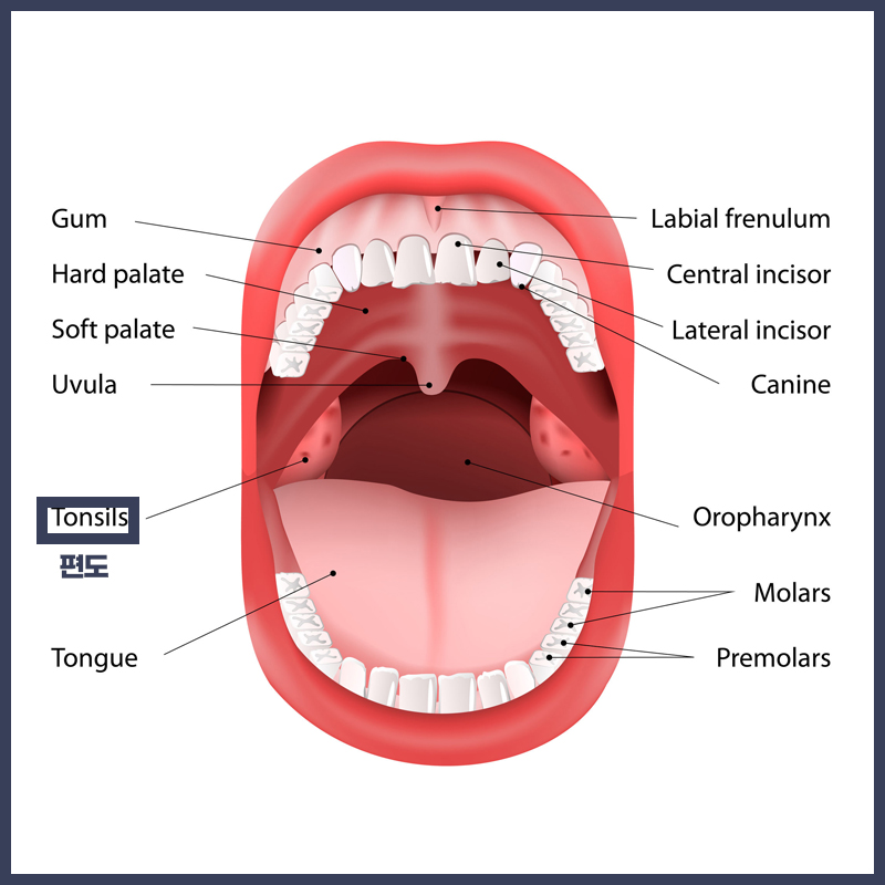 편도조직은 목 안쪽, 코, 후로 부분에 위치하고 있는데, 코와 입을 통해 들어오는 통로를 감싸고 외부에서 들어오는 세균을 방어하기 위해 항체를 만들어 주는 림프조직입니다. 편도선은 구강에 들어오는 세균이나 바이러스를 일차적으로 방지하는 역할이라고 생각하시면 됩니다.