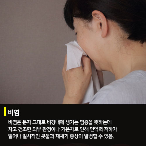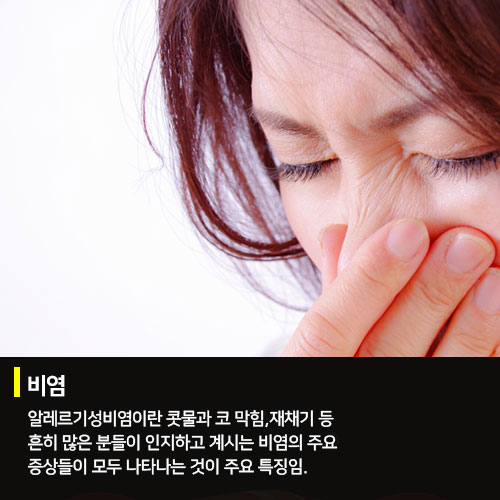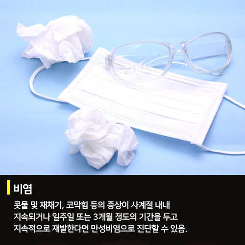 셋째, 위축성 비염은 비강 내 구조가 위축되어 있는 상태의 비염으로, 코 점막 내부의 분비선 기능이 저하되어 건조하기 쉬워집니다.네 번째 알레르기성 비염은 콧물이나 코막힘, 재채기 등 많은 분들이 인지하고 있는 비염의 주요 증상이 모두 나타나는 것이 주된 특징입니다.알레르기성 비염은 먼지와 동물의 털, 계절적인 요인인 꽃가루 등에 의해 일어나며, 주로 환절기에 심해집니다.