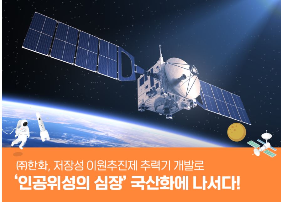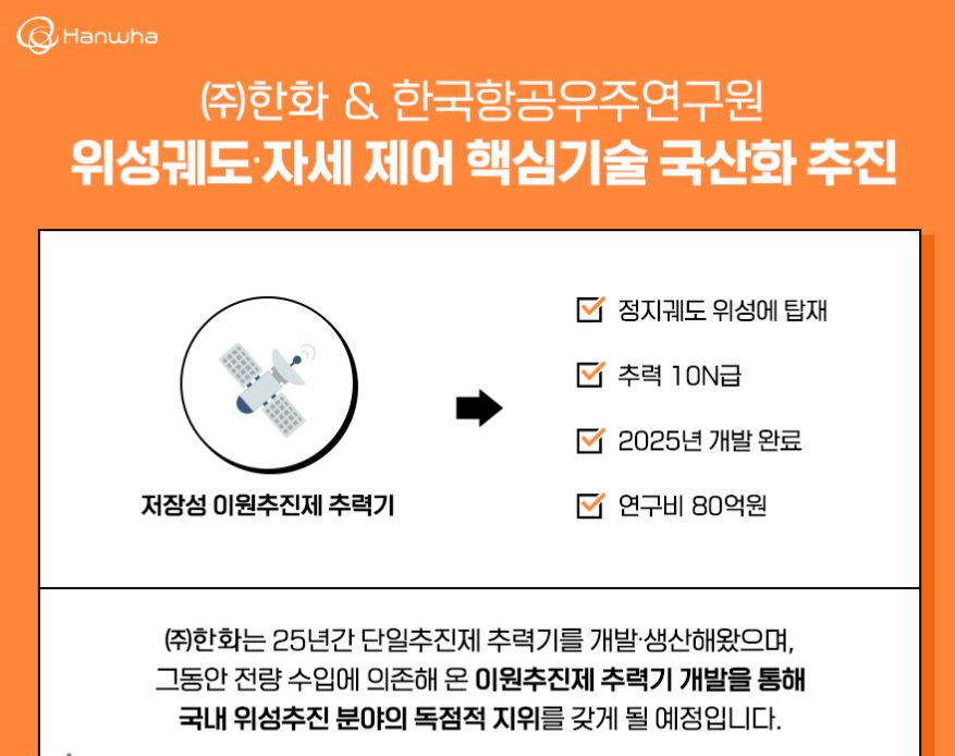 한화에서 인공위성의 심장으로 불리는 이원추진제 추력기를 국산화할 것으로 보인다.그동안 이 핵심 기술은 독일과 다른 해외 기업에 의존해 왔지만 국내 기업으로는 처음으로 한화가 인공위성 국산화 프로젝트를 시행한다고 합니다.