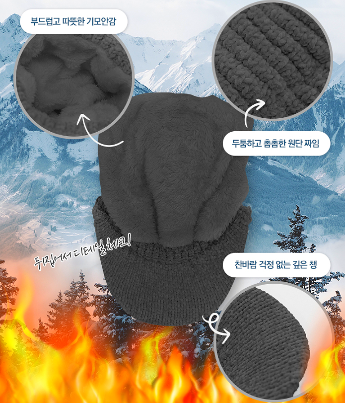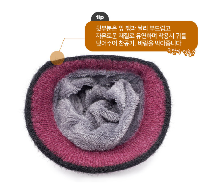 머리 부분은 앞챙이와 달리 부드럽고 자유로운 재질로 머리 부분과 귀 부분을 덮어 찬 공기, 바람 등을 막아줍니다.