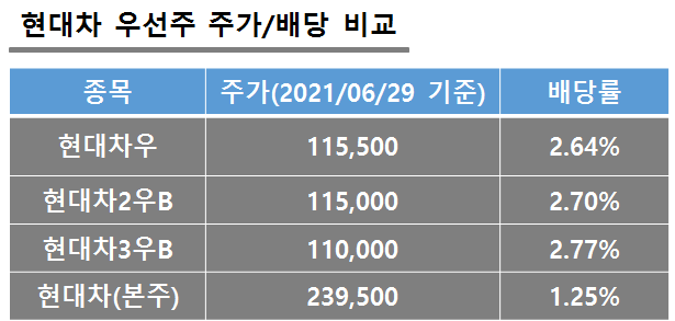 따로 정리했다>우선주는 주주 총회에서 의견을 행사할 수 있는 의결권이 없는 대신, 1주당 가격이 보통주보다 낮은 배당을 더 받을 수 있는 주식을 우선주. 일반적으로 개인 투자가의 경우 의견을 행사하는 수준의 주식을 보유하는 경우가 많지 않아 배당금을 오히려 많이 얻을 수 있는 우선주를 인수하기도 한 방법이다. 기업 입장에서는 의결권 없는 주주를 모으고 자금을 조달하기로 회사 경영에 개입하지 않기 때문에 기업 입장에서는 더 편하다고 볼 수 있다. 우선주가 다양하므로 현대 차 우선주의 종류에 대해서 그 차이에 대해서 한번 정리하자. 현대 차 우선주의 종류는 3종류 있다. 현대 차 친구, 현대 자동차 2친구 B, 현대 자동차 3친구 B결론으로 말하면 주가가 같은 때는 현대 자동차 2친구 B을 사면 되는데 왜냐하면 B가 달린 현대 자동차 2친구 B와 현대 자동차 3친구 B모두 최저 배당률이 있으나 현대 자동차 2친구 B의 최저 배당률이 3친구 B보다 높은 액면가의 2%이기 때문이다.(B가 붙은 이유가 바로 최소 배당률이지만 B는 Bond채권의 약어로 2펠로우와 3차는 각각 얼마 못해도 액면가의 2%로 1%의 최저 배당금을 지급한다는 것.)또 우선 주식에 의한 참여/비참가적 구분이 있지만 참여적 우선주는 결산 배당을 실시하고 남은 잉여 이익금에 대해서 추가 배당을 실시한다.당연히 비참가적 우선주보다는 참여적 우선주가 좋다. 물론 잉여 이익금에 추가로 배당을 한 적이 없다고 들었다. 플러스 우선주에 대한 누적적/비누적으로 엇갈리는 부분이 있지만 모두가 예상하게 누적적이 더욱 좋다.