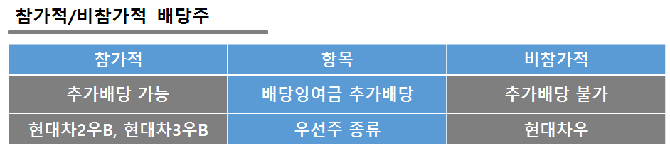 구분내용우선주 누적 올해 배당하지 못한 경우 내년 배당시 전년분까지 추가 지급 해당사항 없음 비누적 올해 배당하지 못했더라도 내년 배당대 전년분까지 추가 지급X모든 현대차 우선주