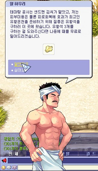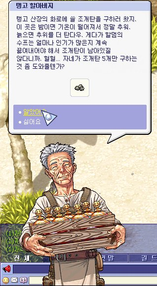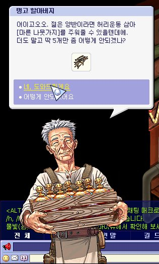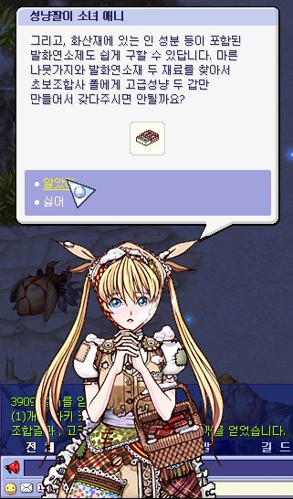 그 다음 필드4로 가서 최채책 아저씨를 만나서 화산재 퀘스트를 깬 다음 애니를 만나야 하는데 아직 고급 성냥 2개가 모자라서 발화 연소제부터 구해 다시 마른 나뭇가지를 구입한 다음에