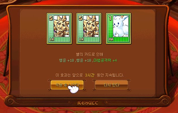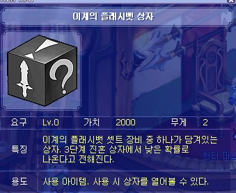 둘 다 깠는데 세 개는 안 나오고(일반 장비 안에는 나왔지만 쓸 수 있는 게 없었다), 한 구와 두 구가 나왔다.링이 하나 나와서 지금 별로 장비가 없는 마법사용으로 넘겼는데 능력치 안습; 나중에 좋은거 달아줄게..
