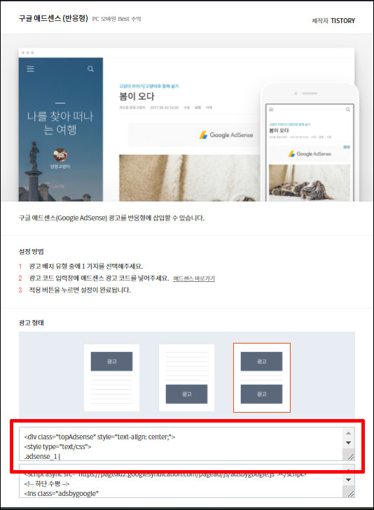 그리고 티스트리 프라인으로 와서 어드센스 반응형을 선택합니다.
