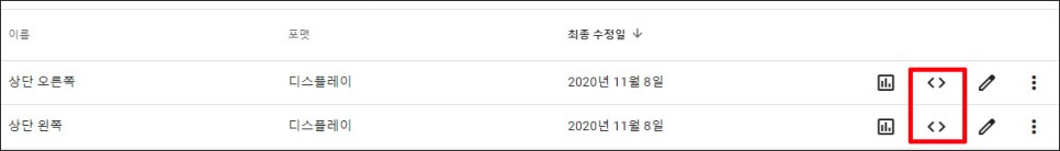 여기서 저는 상단 오른쪽과 상단 왼쪽 측이라는 광고 단위를 만들었습니다여기서 코드 표시를 선택합니다.