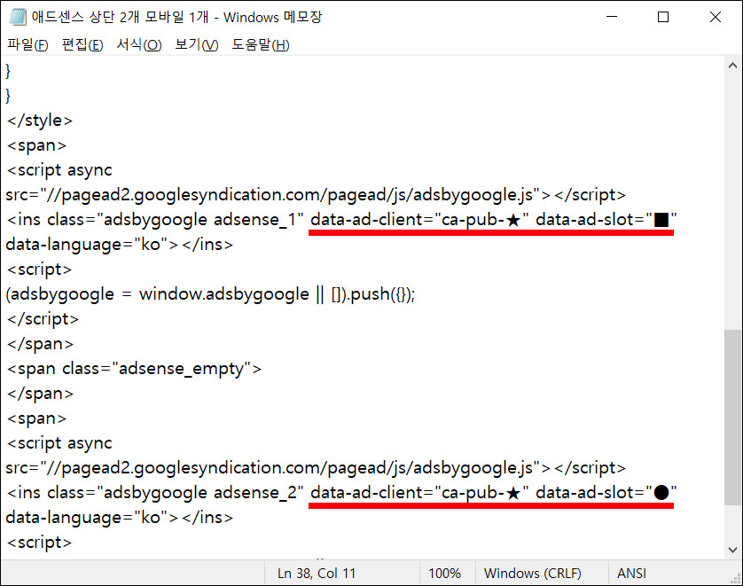 그리고 상단 광고에 메모장 소스를 복사하여 붙여넣으면 PC 버전에는 상단 광고가 2개, 모바일 버전에는 1개가 표시됩니다.