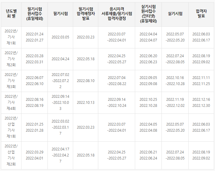 (홈->자격검정안내->시험일정->2022년도 시험일정)