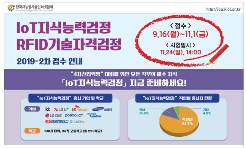 14회 1. 접수기간 : 09월 19일(월) ~ 10월 28일(금) 2. 시험일시 : 11월 27일(일) 14:003. 합격자발표 : 12.09(금)RFID기술자격검정(GL-국가공인민간자격 / SL-등록민간자격증)입패니다-매니지먼트응시료: 40,000₩자격증 발급비: 6,000₩문제수: 80문항(객관식, 100분)31회 1. 접수기간 : 03.21(월)~04.29(금) 2. 시험일시 : 05.29(일) 14:003. 합격자발표 : 06.10(금)32회 1. 접수기간 : 09월 19일(월) ~ 10월 28일(금) 2. 시험일시 : 11월 27일(일) 14:003. 합격자발표 : 12.09(금)파니다에 들어가다응시료: 100,000₩자격증 발급비: 6,000₩문제수: 50문항(객관식, 60분)/20문항(주관식, 100분)제19회 1. 접수기간: 09월 19일(월) ~ 10월 28일(금) 2. 시험일시: 11월 27일(일) 14:003. 합격자발표: 12.09(금)제19회 1. 접수기간: 09월 19일(월) ~ 10월 28일(금) 2. 시험일시: 11월 27일(일) 14:003. 합격자발표: 12.09(금)제19회 1. 접수기간: 09월 19일(월) ~ 10월 28일(금) 2. 시험일시: 11월 27일(일) 14:003. 합격자발표: 12.09(금)#2022 #한국지능형사물인터넷협회 #KIoT-CP #IoT #지식 #능력 #IoT지식 #IoT지식능력 #IoT지식능력검정 #RFID #GL #RFID-GL #RFID-SL #시험일정#2022 #한국지능형사물인터넷협회 #KIoT-CP #IoT #지식 #능력 #IoT지식 #IoT지식능력 #IoT지식능력검정 #RFID #GL #RFID-GL #RFID-SL #시험일정