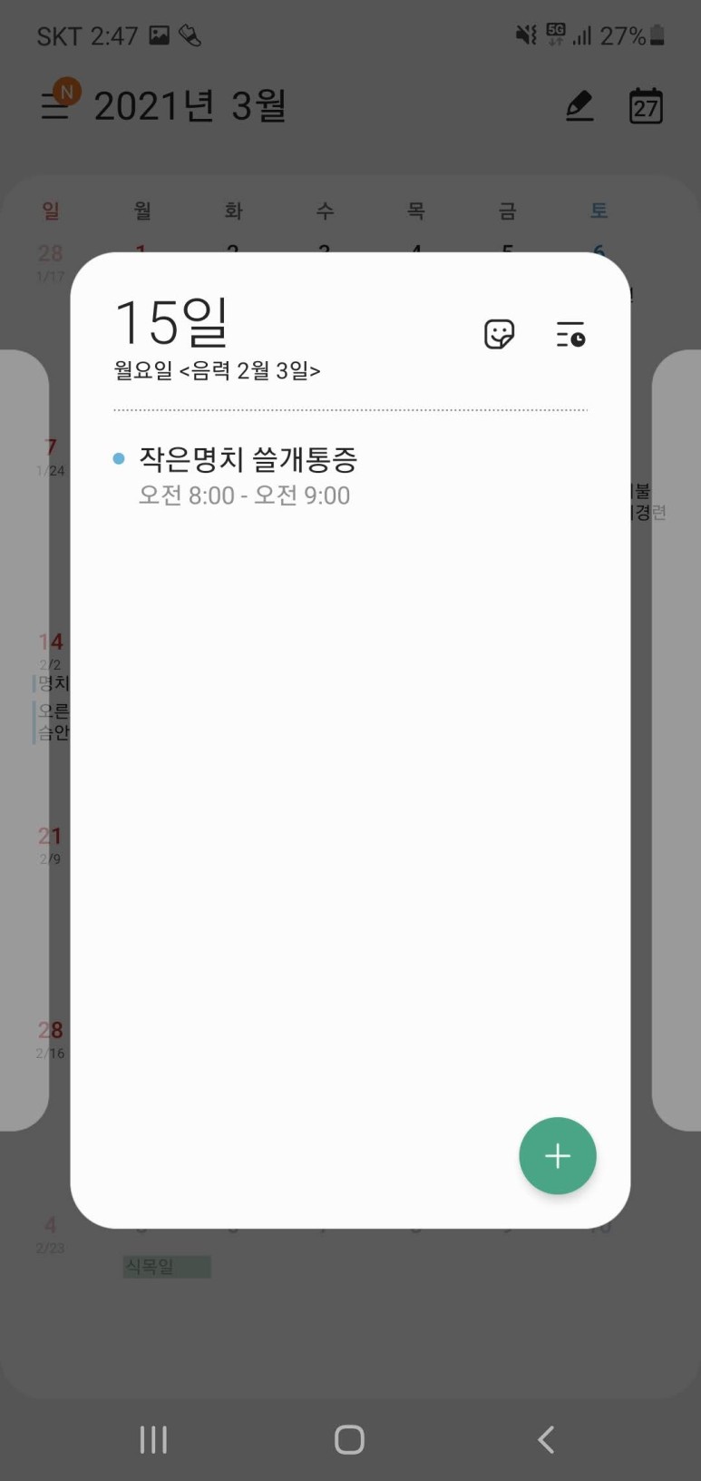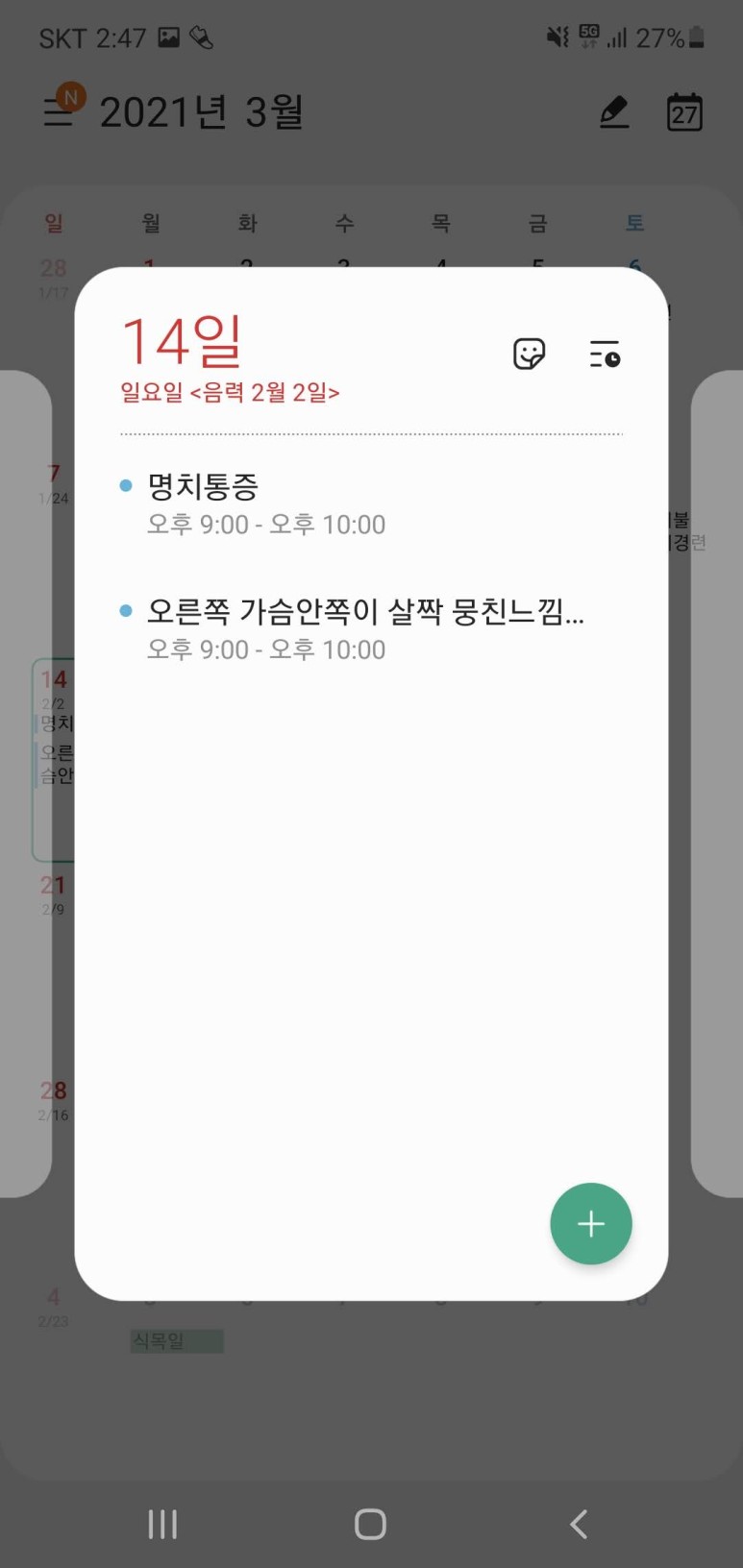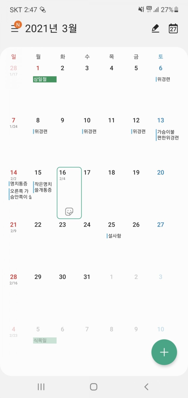 그렇게 저는 위경련을 달력에 쓰기 시작했습니다. 2월에는 한 번