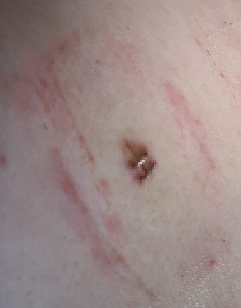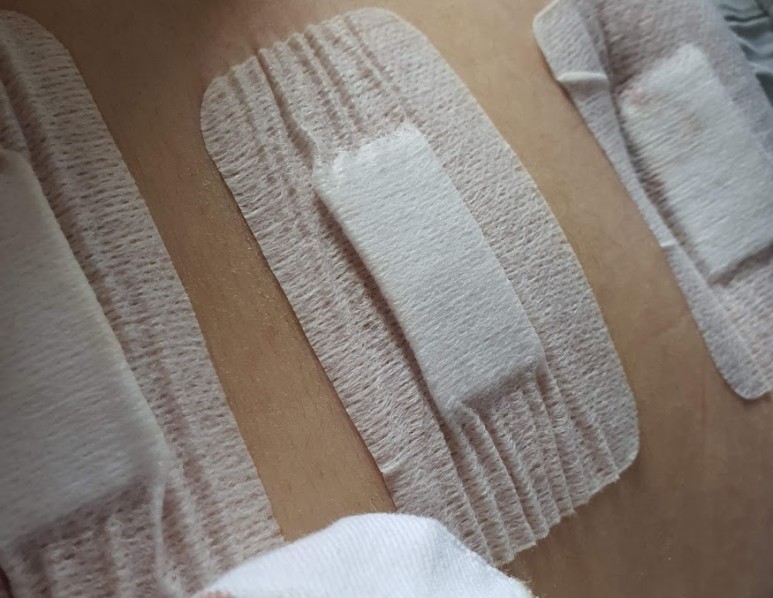 수술 부위는 이렇게 의료용으로 꽂아놓은 상태였어요. 상처부위 이외의 부분을 봐주세요. ㅜㅜ 피부가 나쁜 나는 배에 밴드를 붙인 형태로 피부가 정말로 소란스럽습니다. 가려움도 심해 제대로 씻을 수 없으니 물티슈로 닦는 것이 최선.
