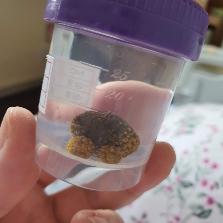 나온 담석은 사람마다 담석의 모양이 다른데 저는 구겨진 모양이 나오고 있습니다.입원해서 힘들었던 점은 자리마다 TV가 있었는데 입원해 있는 분이 새벽까지 TV를 틀어 놓고 잠을 잘 못 잔 것과 전신마취의 부작용으로 열이 오르고 해열제를 맞아 간호병동 입구 바로 앞이 입원실인 것이 시끄러워서 정말 잠을 설쳐 하루종일 잠에서 깨는 것을 반복했습니다.
