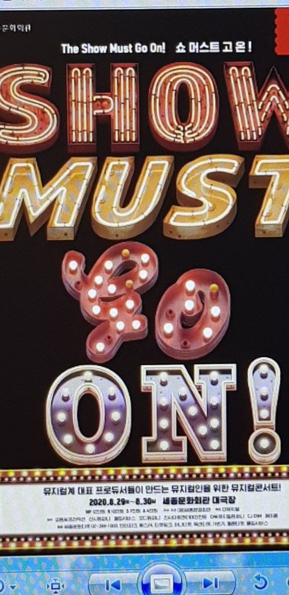 코로나 19시대를 살아가는 뮤지컬인의 위기 극복을 위한 하나의 목소리,<The Show must go on>-국내 뮤지컬 산업을 이끌어 온 8개 대표 프로듀서들과 대한민국 대표 공연장인 세종 문화 회관이 뮤지콜잉을 돌리 나서고 있는 목표 기금 5억 총 500명에 각 100만원씩 지급을 목표에 콘서트를 개최하는 것이다 코로나 19시대를 살아가는 뮤지컬인의 위기 극복을 위한 하나의 목소리,#뮤지컬 갈라<The Show must go on>