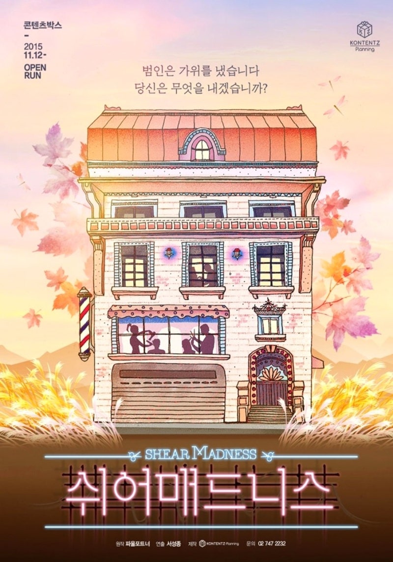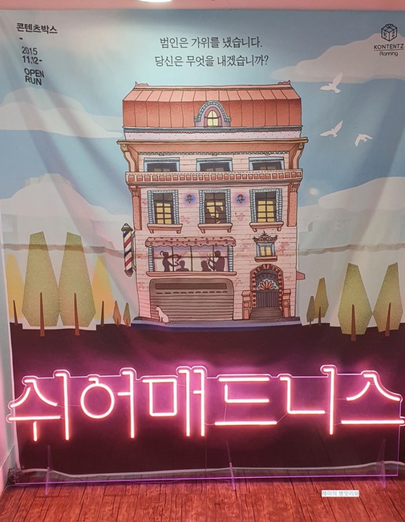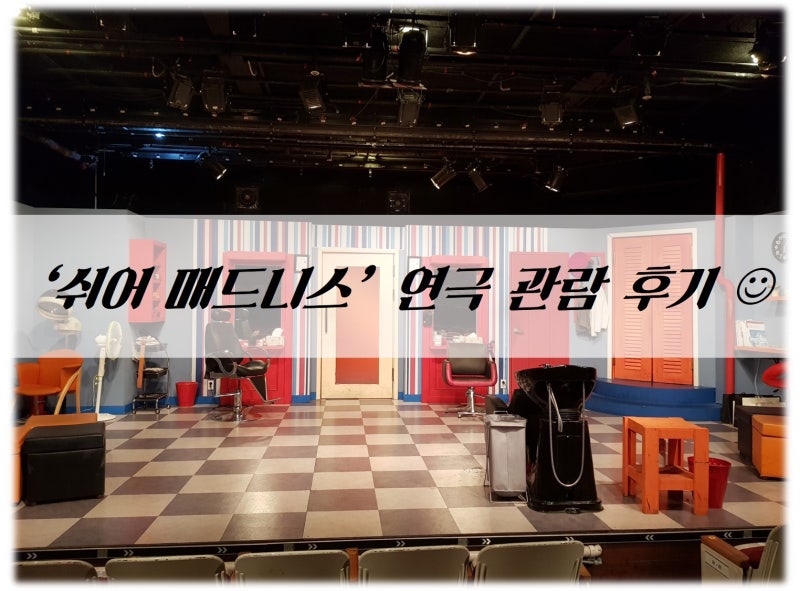 2층 C열 9, 10번 좌석의 시야는 이렇다 할 눈에 잘 보여서 좋지만 2층 앞부분 난간이 낮아 조심해서 가야 했고, 2층 통로는 앞자리에만 있어 쉬는 시간이나 시작하기 전에 계속 사람들이 왔다갔다 해서 오프닝을 자주 볼 수 없었다.연극의 내용은 언제나 수다로 바쁜 ‘방학 맘스 미용실’의 일상이 뒤집히는 날! 미용실 위층에서 일어난 살인사건 용의자를 꼭 찾아야 해! Loading… player_likesound_mutesound_mutesound_volume2sound_volume3 [x]Player Size:0 x 0Current Resolution:0PMax Abr Resolution:0PProtocol:hlsCurrent Bandwidth:Average Bandwidth:Buffer Health:Frame Drop Rate:0/0 도움말라イーセンスVideo Statistic Version 4.29.4 (HLS) Build Date (2022/8/31)NAVER Corp.動画エンコード中です。5분 이상 소요될 수 있으며 영상 길이에 따라 소요 시간은 다릅니다. 오프닝 재생수 180topleft right bottom 마우스를 드래그하십시오.360° Video 도움말 MULTI TRACK 멀티트랙 트랙별 영상은 우측 관련 영상에서 볼 수 있습니다.선거광고안내뮤트00:00|01:52화질선택옵션자동144p270p480p720pHD1080pHD화질전체화면00:2400:401:0701:29광고정보더보기초후SKIP초후재생SKIP광고후이어집니다.SNS 공유 소스 코드 Band Twitter Facebook Blog Cafe URL 주소 복사 HTML 소스 544x306740x416936x5261280x720 복사 Flash 미지원으로 Object 코드를 확산시키는 기능은 더 이상 지원되지 않습니다.도움말 플레이어 URL 복사 레이어 닫기오프닝 Loading… player_likesound_mutesound_mutesound_volume2sound_volume3 [x]Player Size:0 x 0Current Resolution:0PMax Abr Resolution:0PProtocol:hlsCurrent Bandwidth:Average Bandwidth:Buffer Health:Frame Drop Rate:0/0 도움말라イーセンスVideo Statistic Version 4.29.4 (HLS) Build Date (2022/8/31)NAVER Corp.動画エンコード中です。5분 이상 소요될 수 있으며, 영상 길이에 따라 소요시간은 다릅니다. 53-2. 연극 <시아머드니스> 후기 재생수 220topleft right bottom 마우스 드래그 해주세요 360° Video 도움말 MULTI TRACK 멀티트랙 트랙별 영상은 오른쪽 관련 영상에서 볼 수 있습니다.선거광고안내뮤트00:00|01:17화질선택옵션자동144p270p480p720pHD1080pHD화질전체화면00:1500:3600:4601:02광고정보더보기초후SKIP초후재생SKIP광고후이어집니다.SNS 공유 소스 코드 Band Twitter Facebook Blog Cafe URL 주소 복사 HTML 소스 544x306740x416936x5261280x720 복사 Flash 미지원으로 Object 코드를 확산시키는 기능은 더 이상 지원되지 않습니다.도움말 플레이어 URL 카피 레이어 닫기 53-2. 연극 <Shymadness> 후기 오프닝에서는 배우가 정말 머리 감는다, 영상 속 내용은 오프닝 부분이 포함되어 있어 오프닝 스포일러를 원하지 않으면 전달해주길 바라며 오후 5시 연극이었는데 4시 50분쯤부터 배우가 나와 노래를 틀어주고 잠시 후 배우들이 올라가 오프닝을 하면서 어느새 안내 멘트가 나온다.그리고 바로 오프닝을 이어 연극을 시작한다(그리고 안내멘트가 나오기 전까지 촬영이 가능한데, 이날 나와 내 친구들 외에는 아무도 촬영을 하지 않아서 부끄럽다..)