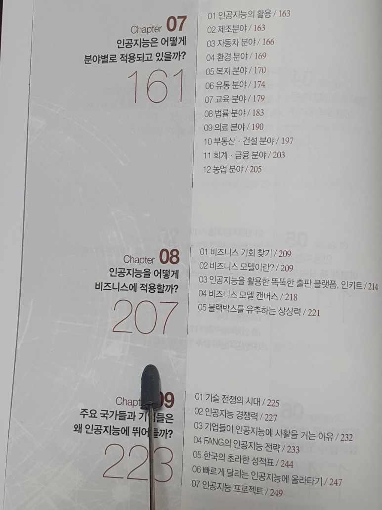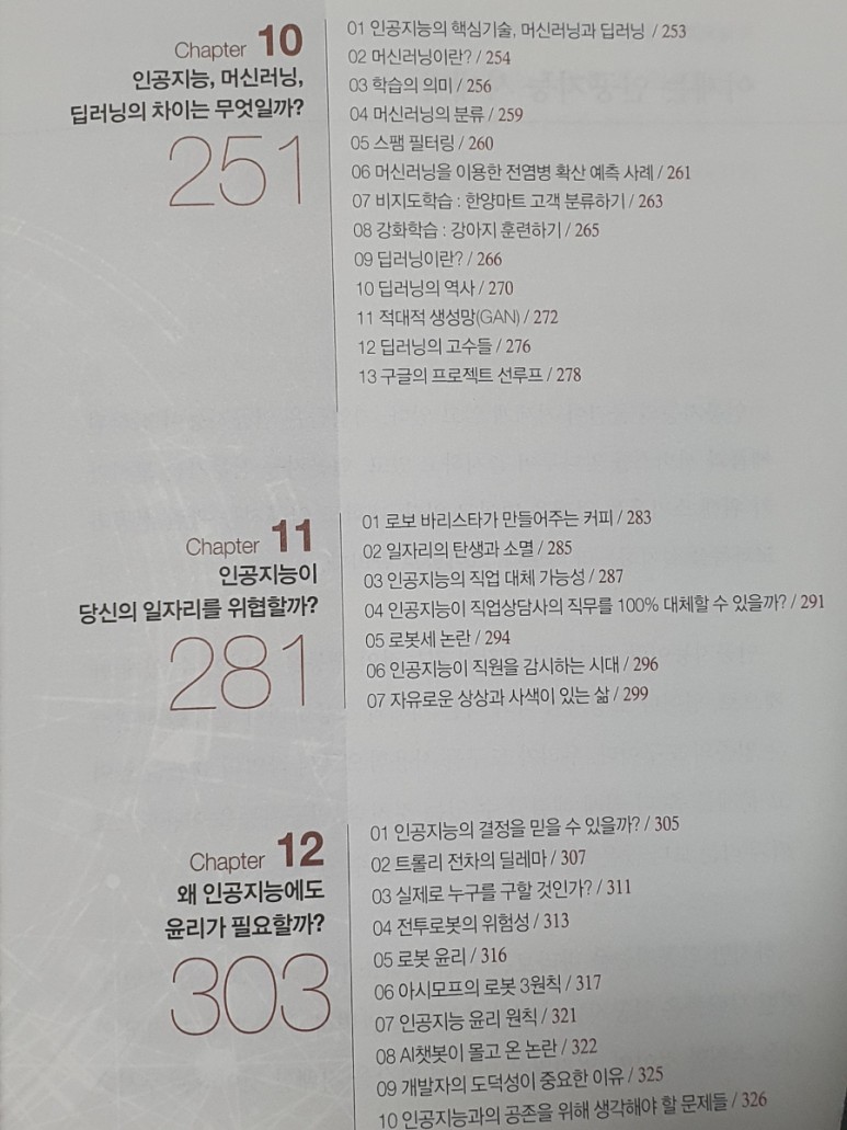 오늘 소개해드릴 책은 바로 이 AI에 대한 모든 지식을 망라한 보고서이자 미래 예측에 관한 모든 것이다. 인공지능은 앞으로 수많은 분야를 변화시킬 것이고 일자리도 변화시킬 것이다. 인공지능이 일부 일자리를 대체할 수도 있겠지만 인공지능을 통해 새로 등장하는 일자리도 늘어날 것이다. 우리는 이 인공지능이 변화시킬 기회와 위기를 정확히 파악하고 미래를 내다보는 능력을 갖춰야 한다.인공지능 기술은 이미 많은 분야에 적용되고 있다. 내비게이션, 생활가전, 스마트폰, 체온측정기, 음성인식 서비스, 번역기, 사진을 멋지게 만들어 주는 사진 앱, 골프장 거리측정기 등 집과 직장, 차안, 레저시설에 이르기까지 모든 영역으로 퍼져 있다. 많은 기업은 이미 AI 챗봇을 활용해 고객 상담 서비스를 실시하고 있다. 물론 아직은 인간상담원보다는 고객 응대의 정확도가 낮은 편이다. 하지만 기술이 발전해 적당한 데이터가 쌓이면 성능은 높아질 수밖에 없다.