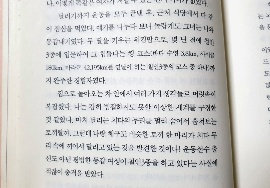 마녀체력 중 오늘 좋았던 부분… 놀랍게도 그녀는 나와 동갑내기였던 것. 두 딸을 키우는 워킹맘으로 몇 년 전 철인 3종에 입문해… 운동선수 출신도 아닌 평범한 동갑내기 여성이 철인 3종을 하고 있다는 사실에 적잖이 충격을 받았다.마녀 체력 – 철인 3종이니까
