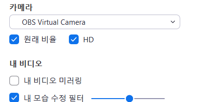 줌의 비디오 설정에서 카메라를 OBS Virtual Camera로 설정합니다. 그러면 아래의 우측의 사진과 같이 OBS로고가 표시됩니다. 잘 연결돼 있다는 뜻이에요 이제 OBS에서 하는 모든 작업이 줌에 들어갈 준비가 되었습니다.
