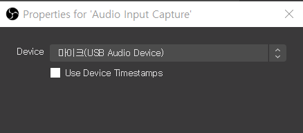 이번에는 Audio Input Capture를 추가해서 마이크 소리를 잡아보도록 하겠습니다 제가 접속한 캡처보드에는 아래와 같은 이름으로 마이크가 설정되어 있습니다.