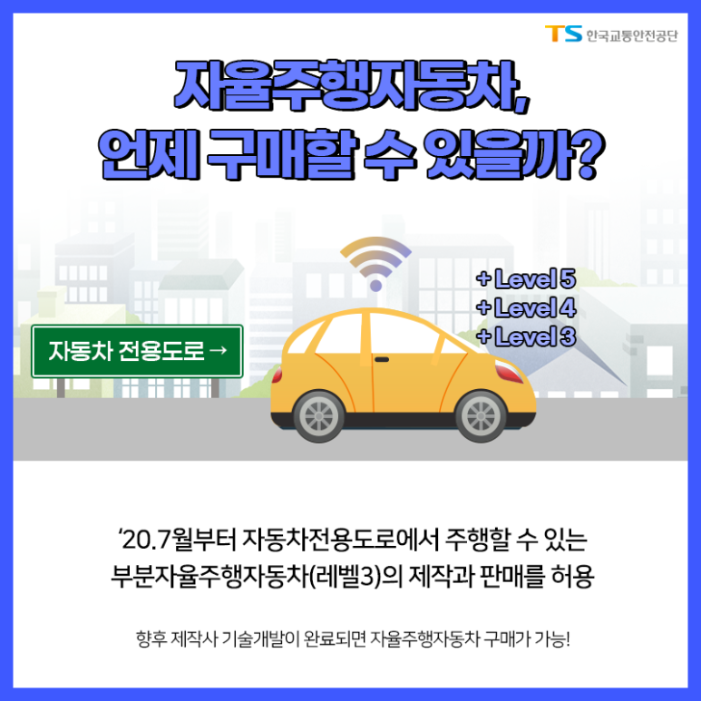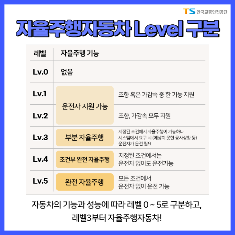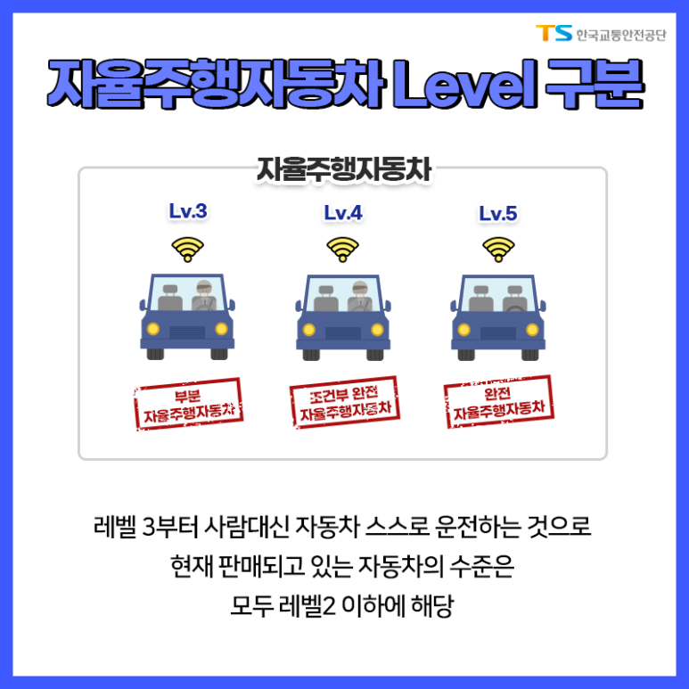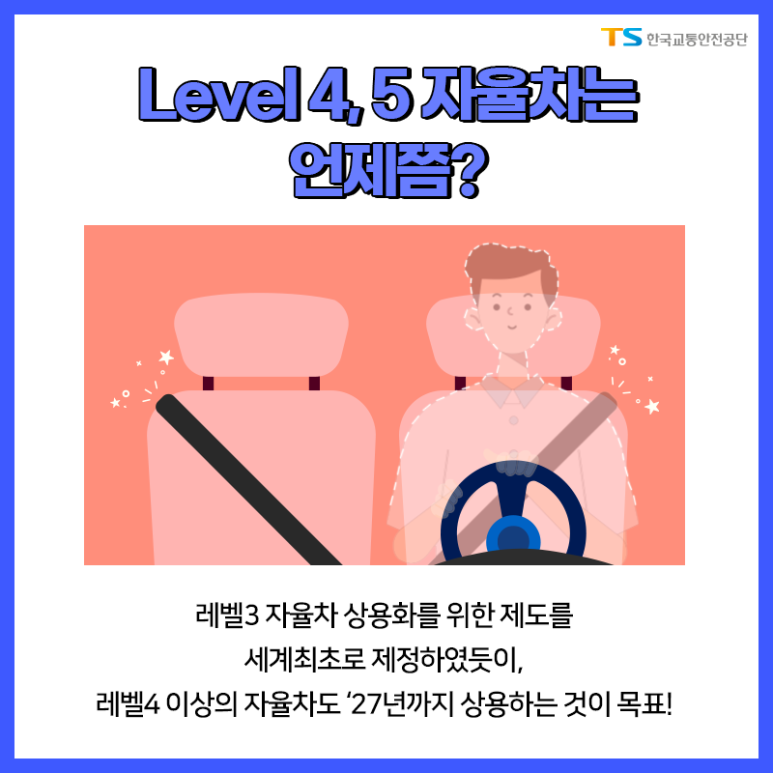 LEVEL이 있다고? 자율주행 차에 자율주행자동차 LEVEL 구분 현재 시판되고 있는 자율주행 자동차 레벨 2 이하 1920년 7월부터 레벨 3의 제작과 판매 허가 ●레벨 4 이상 2027년까지 상용화 목표 <자료출처: 한국교통안전공단 공식 블로그 발췌>