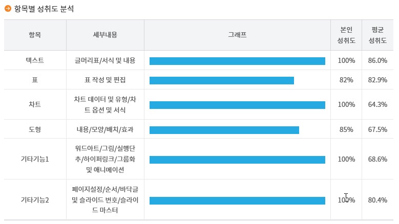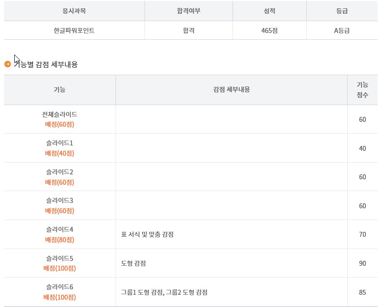 2차 ITQ 파워포인트 시험은 첫 번째 시험의 충격적인 결과 때문인지 집중적으로 실시돼 465점이라는 고득점으로 A등급을 받을 수 있었다. 감점을 자세히 살펴보았는데 텍스트, 차트, 기타 기능에서는 만점을 받았지만 표와 도형에서 감점이 많이 된 것 같다. 도형은 킬러라는 말이 많기 때문이라지만 표는 평균점수보다 낮아 아쉬웠다.