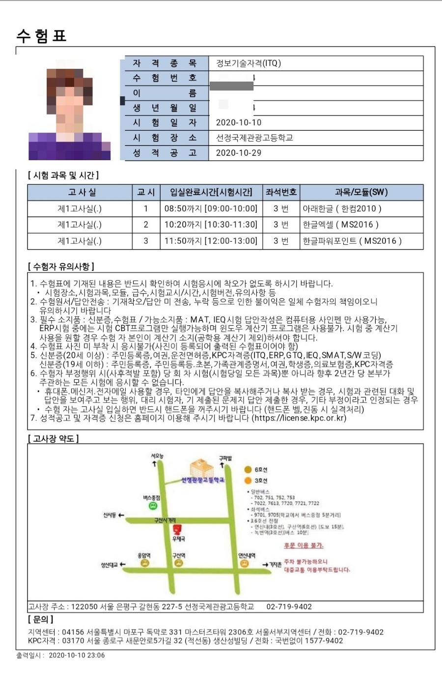 첫 시험 당시의 수험표다. 선정 국제관광고등학교에서 시험을 치렀으며, 시험시간은 다음과 같다. 시험을 보면, 그다지 어렵다고는 생각하지 않았던 것 같다(엑셀 이외). ITQ 파워포인트에 점 편집이라는 어려운 파트가 있다고 들었는데 이 시기와 비슷한 시기에 없어졌다는 얘기를 듣고 편하게 읽은 것도 있고 책만 잘 따라하면 풀릴 것이라는 확신이 있었기 때문이다. MOS 파워포인트 자격증도 어렵지 않다. 근데 반전이 갑자기 파워포인트가 B등급? 인용구를 써보고 싶어서
