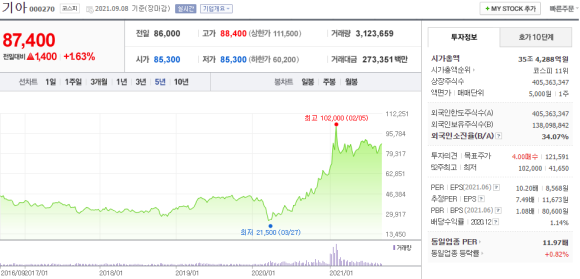2016년부터 보합 후 2020년 3월에 하락한 후 2021년 1월까지 주가는 상승했지만 현재까지 보합세인 비교적 재미없어 보이는 현대차 주가 흐름이라고 생각합니다.