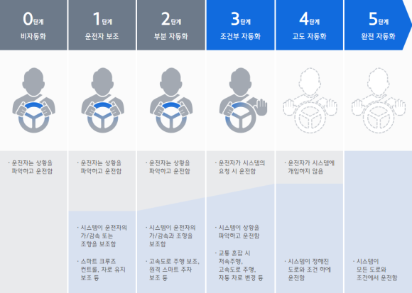 0단계(레벨):비자동화·운전자는 상황을 파악하고 운전자 1단계(레벨): 운전자보조·운전자는 상황을 파악하고 운전자·시스템이 운전자 가/감속 또는 조향보조 스마트 크루즈컨트롤, 차선유지보조 2단계(레벨): 부분자동화·운전자는 상황을 파악하고 운전자·시스템이 운전자 가/감속과 조향보조, 고속도로주행보조, 원격 스마트주차보조 3단계(레벨): 조건부 자동화·운전자가 시스템을 요청하면 운전자·교통혼잡시에 따른 저속주행시스템이 정해졌다.